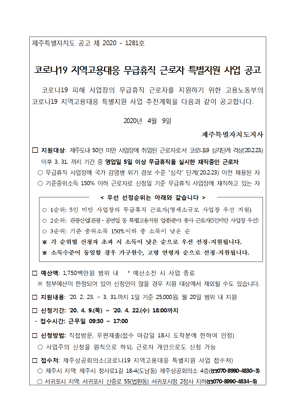- 제주상공회의소 코로나19 지역고용대응 특별지원 사업 접수처