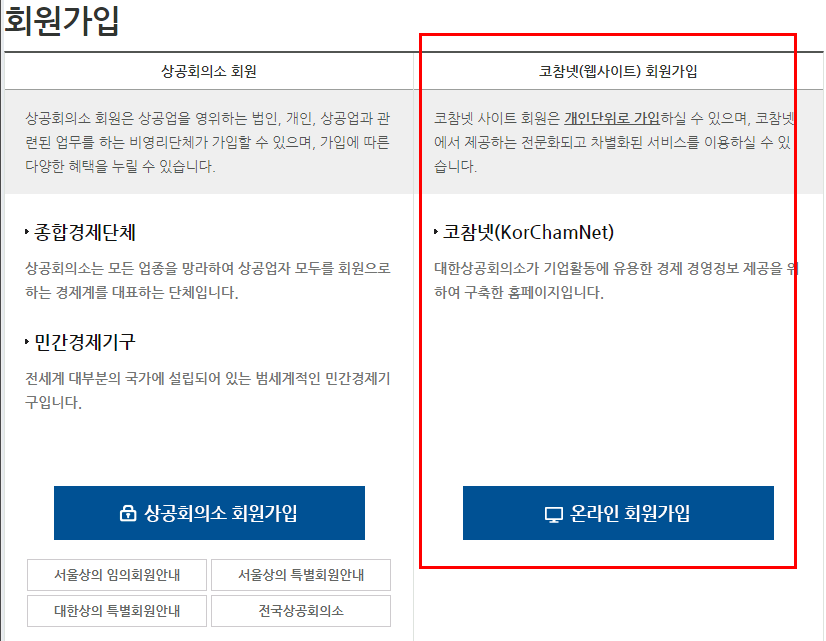 상공회의소 회원 뿐만아니라 코참넷(개인)도 이용할 수 있는 서비스에요.