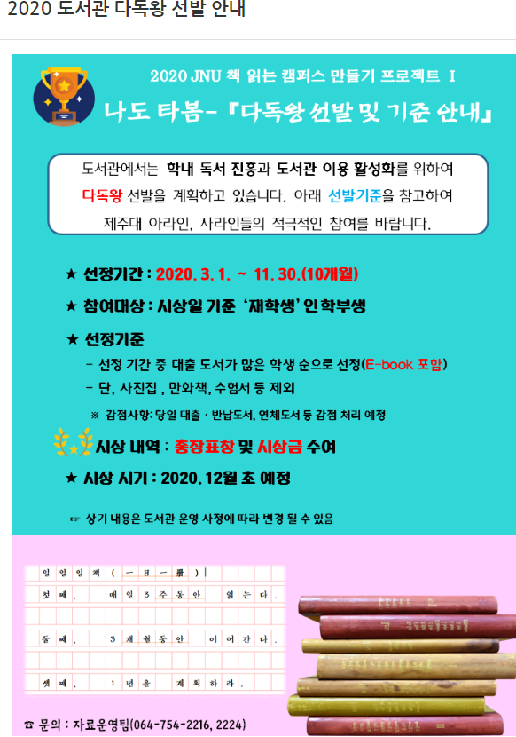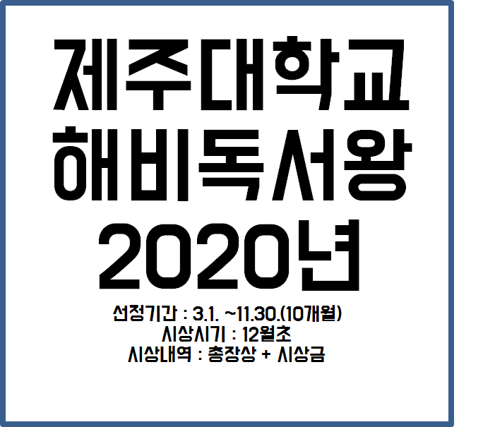 제주대학교 중앙도서관에서 2020년 다독왕을 뽑는다고 합니다.