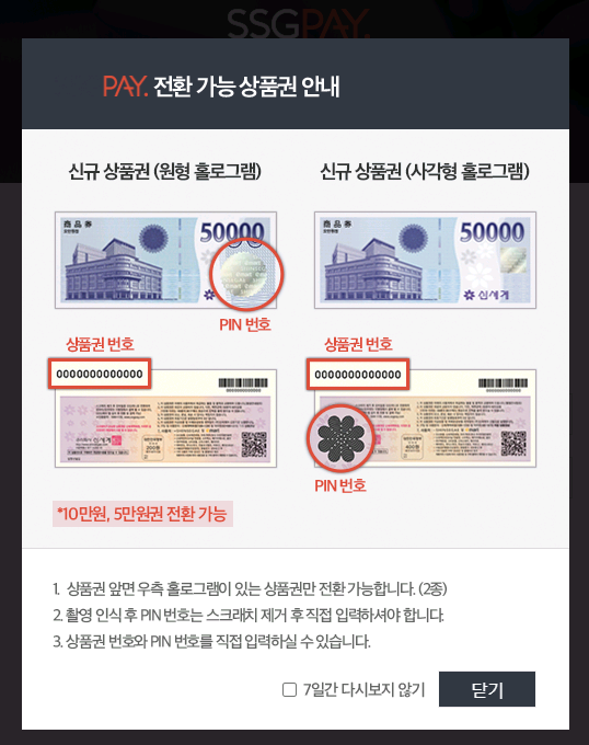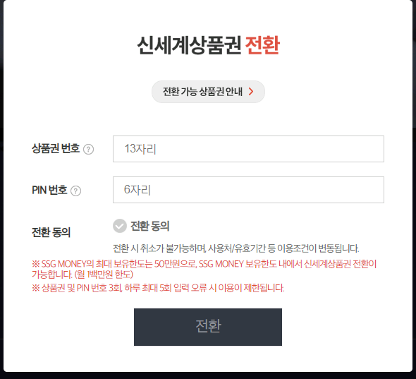 8. 상품권 앞면 스크레치로 긁으면 [PIN 번호 6자리]와 뒷면 [상품권번호]를 입력하고 전환버튼 누른다.