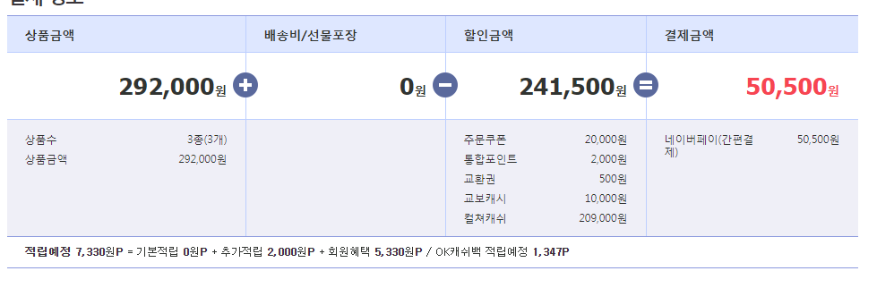 오픈적립(10,000원) + 구매적립(7,750원) + 네이버적립(505원) + 오케이캐쉬백(1,347p)