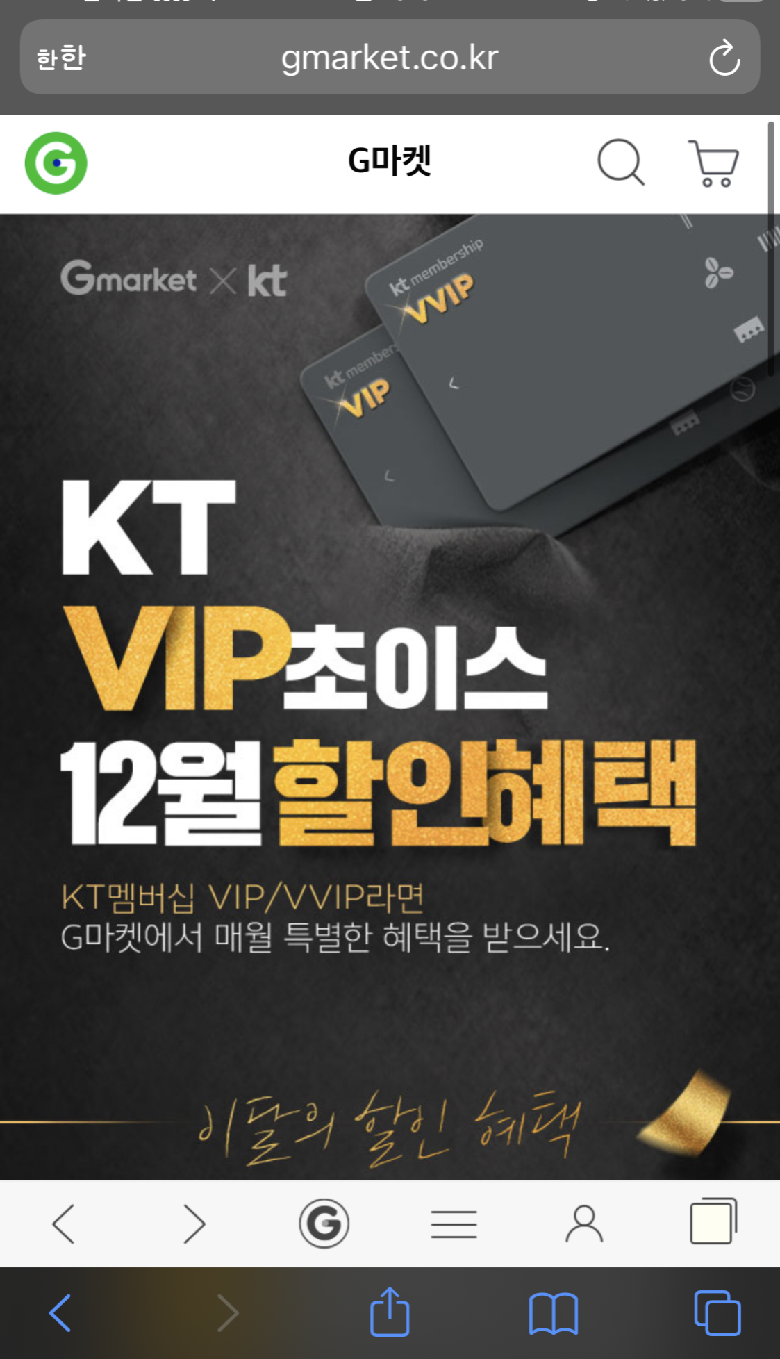 KT VIP멤버십 혜택 중에 G마트 6천원 할인 쿠폰이 있다. 2만원 이상시 사용 가능하다고 해서 이번달은 할인받으려고 G마켓 쿠폰을 받았는데, 왜 내가 사려고 하는 것마다 KT할인이 적용이 안되는 걸까? 기준 좀 알려 줬으면 좋겠다.