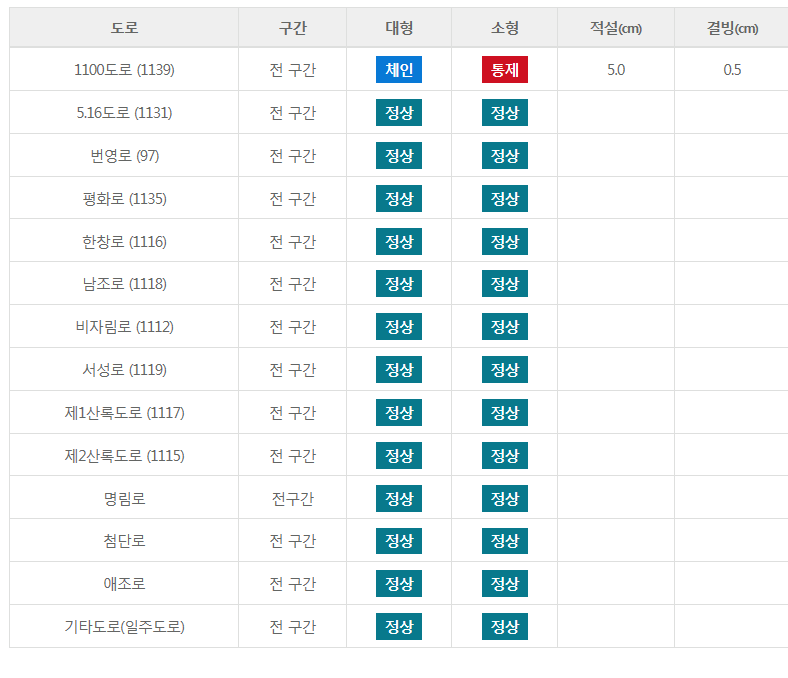 교통통제상황 > 알림마당 > 교통통제상황 2021. 01. 07 17:32 현재 도로명 도로상태 통제상황 비고 구간 적설(cm) 결빙(cm) 1100도로(1139) 전구간 5 1 대형 통제 소형 통제 5.16도로(1131) 전구간 (노선버스 체