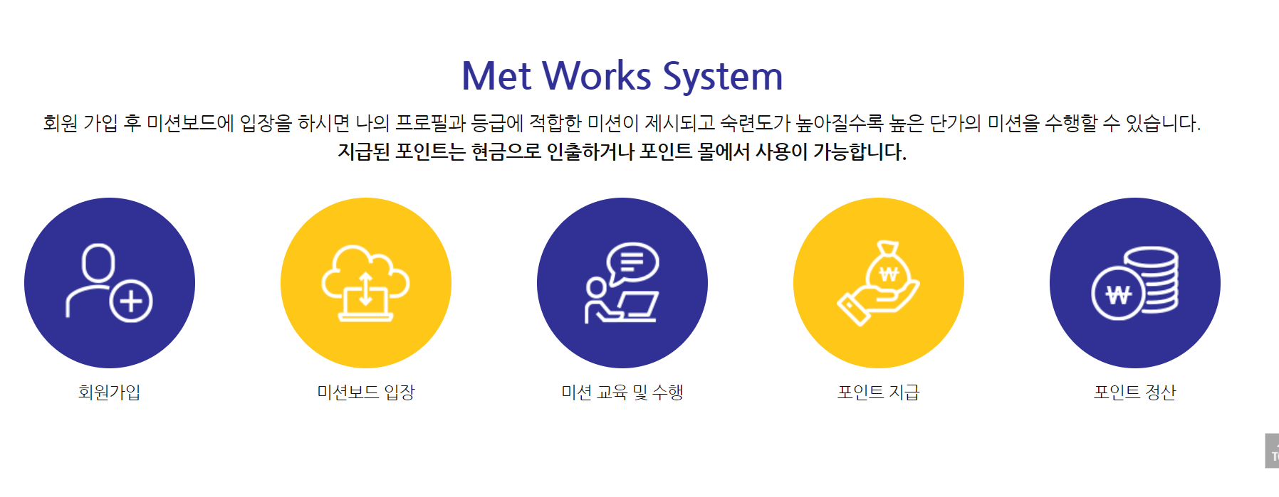 회원가입 후 미션보드에 입장하면 프로필과 등급에 적합한 미션이 제시되고 숙련도가 높아질 수록 높은 단가의 미션을 수행할 수 있다고 한다. 지급된 포인트는 현금으로 인출하거나 포인트 몰에서 사용가능하다고 한다.
