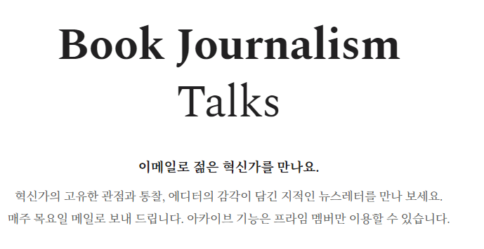 www.bookjournalism.com/newsletter?mwr=be14fa44 북저널리즘 젊은 혁실가들의 인터뷰를 매주 목요일 메일 발송 |
