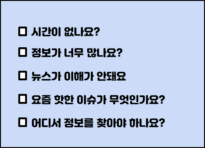 시간이 없나요? 정보가 너무 많아요? 어떻게 정보를 해석해야하나요? 어쩌다가 한번 보는 뉴스 이해가 안돼요. 요즘 핫한 이슈가 무엇인가요?