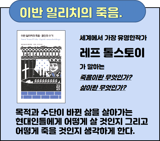 저는 제주 울림나비 독서모임의 책으로 이반일리치의 죽음이라는 책이 선정된 것을 보았을 때, 세상에서 제일 유명한 작가인 톨스토이에 대해 아는 것이 없다는 것을 알게 됐습니다. 안나 카레니나를 꼭 읽겠다고 다짐하고 책을 구매한지 3년이 지났는데 아직 1권도 채 읽지 못한 상태였고, 그 중 기억나는 문구도 첫 소절 뿐이었습니다.